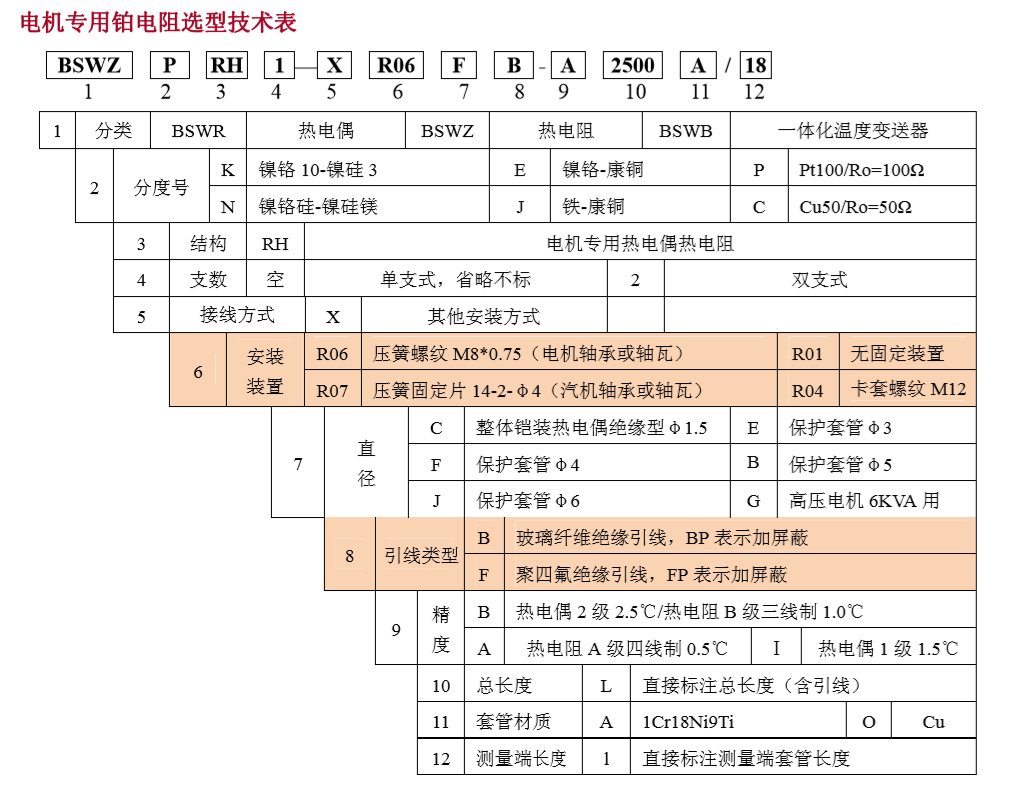BSW□□RH 型電機專用熱電偶/阻是根據大型電機、汽輪機、發電機、鼓風機等旋轉類設備的高速運轉,由于潤滑或冷卻等原因,造成軸承或軸瓦升溫過快或過高,或者由于負荷、電流、絕緣、繞組等因素發生變化,引起線圈繞組升溫過快或過高,要求對軸承軸瓦或線圈繞組實現溫度監控和超溫報警。它主要由測溫探頭、高溫引線、安裝固定裝置等三部分組成,小型測溫探頭緊密可靠地接觸被測面,從而準確地連續地反應出被測點的溫度。它具有測溫精度高、熱響應時間快、結構簡單、安裝方便、成本低、安全可靠、電氣性能穩定、使用壽命長等優點,是大型電機、汽輪機、發電機、鼓風機等旋轉類設備的理想測溫產品,對長期 連續運行的大型旋轉類設備的保護起著非常重要的作用。