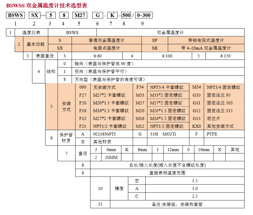 公司設計(ji)(ji)(ji)生(sheng)產(chan)BSWSS工(gong)業雙(shuang)(shuang)(shuang)金(jin)屬(shu)溫度(du)(du)(du)(du)計(ji)(ji)(ji),產(chan)品規格品種齊全,包含普通的(de)雙(shuang)(shuang)(shuang)金(jin)屬(shu)溫度(du)(du)(du)(du)計(ji)(ji)(ji),電接點式(shi),萬向型(xing),帶遠傳的(de)雙(shuang)(shuang)(shuang)金(jin)屬(shu)溫度(du)(du)(du)(du)計(ji)(ji)(ji)和帶4~20mA輸出的(de)雙(shuang)(shuang)(shuang)金(jin)屬(shu)溫度(du)(du)(du)(du)計(ji)(ji)(ji)。安裝方(fang)式(shi)種類(lei)齊全,套管規格多,完全能夠滿足(zu)客戶的(de)定向需求(qiu)。同(tong)時為(wei)了適應市場需求(qiu),設計(ji)(ji)(ji)雙(shuang)(shuang)(shuang)金(jin)屬(shu)溫度(du)(du)(du)(du)計(ji)(ji)(ji)與套管分離,以保證在不停機(ji)的(de)前(qian)提下,更換雙(shuang)(shuang)(shuang)金(jin)屬(shu)溫度(du)(du)(du)(du)計(ji)(ji)(ji)。